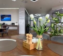 Очень расстроило отсутствие кухни. Плохое месторасположение, поблизости нет никаких магазинов, сплошной частный сектор. Скучный минибар. Редкая уборка номеров. Сам номер красивый, чистый