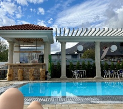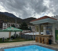На территории есть бассейн температура которого 26-28 градусов по Цельсию, для кого как, жене не зашло. Виды отдельно, видно горы(Аибга и Черная Пирамида). Поэтому, приезжайте, останавливайтесь, изучайте и познавайте)