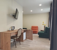 Питание разнообразное. В столовой уютная атмосфера. В номере обстановка без излишней роскоши, но всё современное и качественное. Ванная комната в порядке, всё рабочее. В номере стандартный набор мебели, электрический чайник, набор посуды, кондиционер( отдыхали в люкс) . Озеро в двух шагах, пляж собственный. Мы очень рады, что побывали здесь, и если захочется под лечится и хорошо отдохнуть приедем именно сюда. Рекомендуем всем!!!