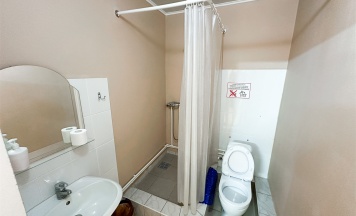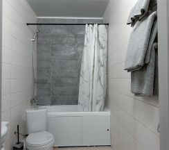 Четырехместный номер с двумя односпальными кроватями и двуспальным диваном на цокольном этаже. Ванная комната в номере.