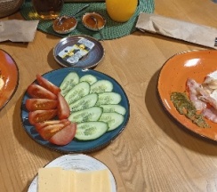 **Парковка** есть, но небольшая, поэтому рекомендую заранее уточнять возможность размещения автомобиля. **Завтрак** порадовал разнообразием: можно выбрать между яичницей, сырниками и бутербродами.
