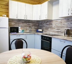 Одноэтажный дом 80 кв.м. Максимально на 8 человек. Во всем доме теплые полы.В доме 2 изолированных спальни с двухспальными кроватями и просторная гостинная с двумя диванами и телевизором.Полностью оборудованная кухня (холодильник, варочная панель, духовой шкаф, микроволновка, чайник) с набором посуды.Два санузла (в 1 - имеется душевая кабина и фен. В другом - стиральная машина).В стоимость проживания входят: постельное белье, полотенца, шампунь,гель д/душа, зубные щетки (по количеству гостей), чай/кофе, wi-fi, мангал/казан и стоянка для автомобилей (под видеонаблюдением).Дом сдается целиком вне зависимости от количества гостей (от 1 до 8 гостей). Заселение от 2-х суток (в новогодние праздники - от 3 суток).