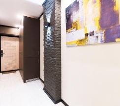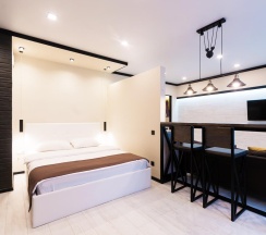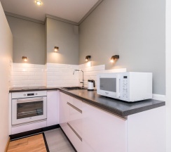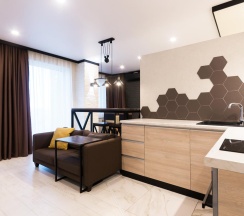 Стильные и современные аппартаменты. Небольшая кухня укомплектована необходимой посудой. Удобное месторасположение, в доме находиться магазин. В квартире чисто, белье свежее. Администратор очень доброжелательна.