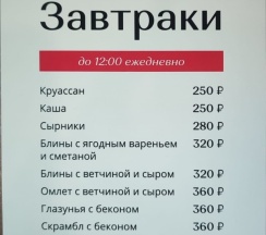 Завтрак надо отстоять очередь минут 20 чтоб заказ сделать, это пекарня и народу со всего комплекса за свежей выпечкой много и еще минут 20 ждать пока приготовят. Как то так.