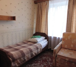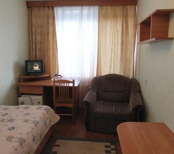 Номера оборудованы: односпальная кровать, письменный или журнальный стол, телевизор, холодильник, кресло или стул, ванная комната: ванна, раковина, унитаз.