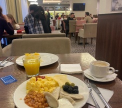 Завтраки шикарные - каша ( каждый день другая), яйца варёные, омлет, колбаса, сыр, сливочное масло, овощи, фрукты (мандарины, гранаты, груши), селёдка), оливки. Всегда несколько горячих блюд - куриный шашлык, сосиски, рис с овощами, картофель запечёный, хашбрауны и ещё много чего. Сырники, блинчики, выпечка, включая круасаны и бельгийские вафли (сгущёнка, мёд, варенье, сметана). Хлопья, шарики, молоко горячее и холодное. Кефир, йогурт. Сок, чай, кофейный автомат с латте, капучино, эспрессо. И это не весь список. Пишу так подробно, потому что удивлена некоторым отзывам о нехватке еды.