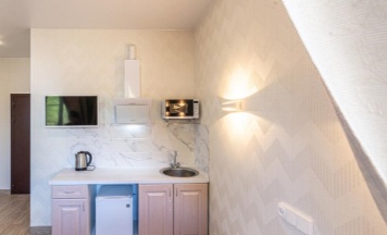 Не понравилось: Дверь в ванну как то плохо закрывается и скрипит. Сауна за 4 часа нагрелась только до 80 градусов на максимальном режиме. При том условии, что на камни воду лить нельзя - это мало. Печь для такого объёма парной явно маловата. В номере есть посуда, раковина и мини кухня, но нет губки для мытья и моющего средства. В помещении с ванной не хватает впитывающего коврика либо швабры автомата для быстрой протирки пола, вода тянется в основную комнату. Штору у окна над кухонной зоной следует укоротить, иначе она выполняет ещё и другие не свойственные ей функции.