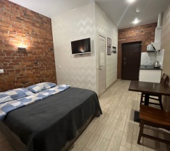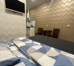 В студии свой сан узел. А также мини кухня со всем необходимым : двуспальная кровать, диван, СВЧ, чайник, посуда. В комнате ТВ , бесплатный WI-FI , встроенный фен, стиральная машина, джакузи.