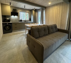 - Первый этаж: кухня-гостиная, двуспальный диван, санузел. Санузел и коридор оснащены теплым полом.