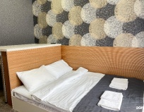 В номере есть всё необходимое: кровать с хорошим матрасом, подушки и одеяла хорошие, чистое бельё, новая мебель,тапочки. Есть кухня, все необходимые столовые приборы, посуда. Есть комната со стиральной машиной.