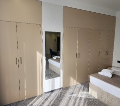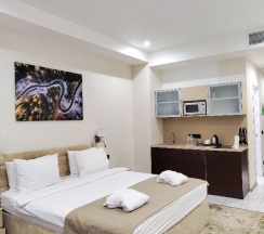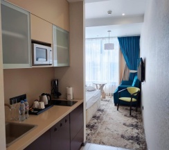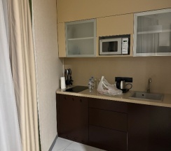 Очень понравилось, а нам есть с чем сравнивать. Для семьи с маленьким ребенком отличный вариант с кухней. Очень много места и прекрасный интерьер. По просьбе поставили манеж для ребенка. Есть парковка. Внизу есть магазин, где есть всё необходимое, если же ассортимент не устроит, можно заказать доставку продуктов, их доставят прямо в номер.