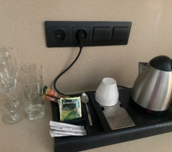 В номере есть абсолютно все для жизни, приятно порадовала зубная щетка, и прочие гигиенические мелочи. Удобная большая кровать. Вода, чай кофе. Фен. Все хорошо, все приличное, все работает.