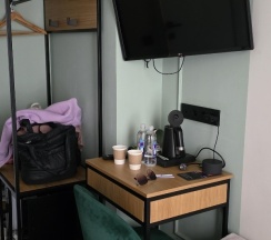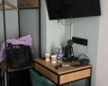 Телевизора в номерах нет, только на общей кухне. Не хватило комода, т к шкаф в номере не функциональный, он закрыт столом. Максимум можно повесить верхнюю одежду