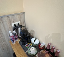На ресепшн вообще не в курсе что происходит у них в номерах А1. Сказали что посуды на общей кухне нет, а там огромный комплект хорошей посуды, приборов, досок, ножей, штопор и даже бокалы. В номере нет питьевой воды и ложки для обуви. Это необходимо запрашивать и самим относить в номер.