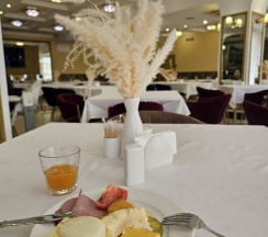 Из плюсов: хороший на мой вкус завтрак: омлет , запеканка , каша, овощи гриль, наггетсы , колбаса, фрукты, кофе !