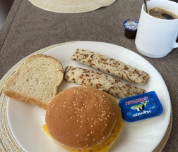Завтрак: чизбургер, два блинчика, хлеб с маслом. Кофе растворимый. Кофе-машина работает с 11. Странно, конечно)