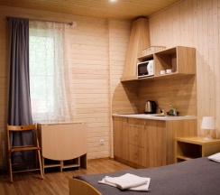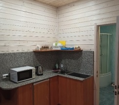 Понравилось: Мы жили в общем доме на несколько номеров, порадовал отдельный вход, туалет с ванной свой собственный, но не в самой комнате, а за дверью. В номере кухня со всем необходимым, посудой, есть плита, холодильник. Перед номером есть свой мангал. Лес рядом, озеро через дорогу. Постояльцы друг другу не мешали, домики отдалены друг от друга.