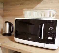 В кухне: стол со стульями, электроплита, микроволновка, электрочайник, холодильник, набор посуды.
