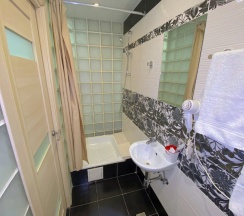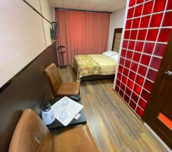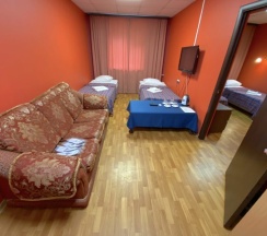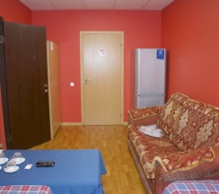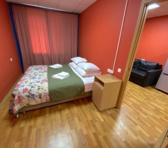 Двухкомнатный номер повышенной комфортности: 1 двуспальная кровать (или 2 односпальные кровати) и 1 диван-кровать. Услуги и удобства: душевая комната, туалетные принадлежности (мыло, шампунь, гель, зубные наборы), фен, тапочки, полотенца, шкаф/гардероб, кабельное ТВ, отопление, холодильник, электрический чайник, бесплатный Wi-Fi