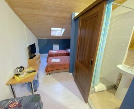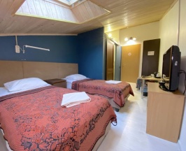 2-местный номер на мансарде (1 или 2 кровати). В номере 1 двуспальная кровать или 2 односпальные кровати. Услуги и удобства: душевая комната, туалетные принадлежности (мыло, шампунь, гель, зубные наборы), фен, тапочки, полотенца, шкаф/гардероб, кабельное ТВ, отопление, холодильник, электрический чайник, бесплатный Wi-Fi