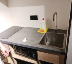 Номер чистый, с современной мебелью, кухней и удобной кроватью.