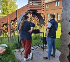 • мебель - 5 стульев на первом этаже и 3 стула на втором этаже (2 стула и стол на балкончика), кровати, раскладной диван, стол в домике и стол с лавочками на веранде, мангал, уличная большая урна,