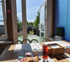 В стоимость был включен завтрак, чему мы также были очень рады и с удовольствием откушали с чудесным видом со второго этажа на Волгу и гостевые домики.