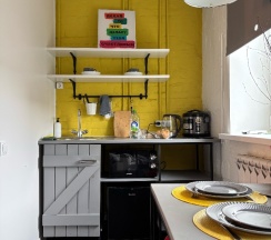 Мы были вдвоем, места предостаточно, очень просторно: зона прихожей и зона кухни оборудованы всем необходимым, есть большая кровать, душевая комната также удобная! В общей зоне есть утюг, если необходимо погладить одежду, а все остальное было в номере - чайник, холодильник, микроволновая печь и даже мультиварка!
