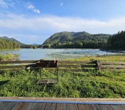 Вид из окна шикарен 😍 Панорамное окно кстати тоже)) Уточки на берегу почти ручные 🦆 По поводу аренды общалась с Лизой - только хорошие впечатления, на базе встретила нас Иветта, прекрасная женщина, сказала по всем вопросам можно обращаться к ней. Чистое пахнущее свежестью постельное белье, комплект полотенец на каждого, дополнительное одеяло на всякий случай, в домике чисто, никакой пыли, чистая сантехника, плечики в шкафу очень порадовали, вся нужная посуда есть, холодильник небольшой, но нам хватило (совсем необязательно тащить с собой 30кг еды, магазины есть, можно раз в день прокатиться), у каждого домика свой отдельный мангал 👍🏼