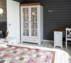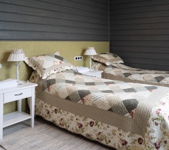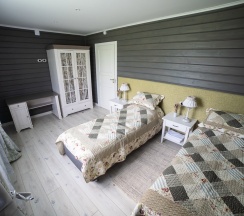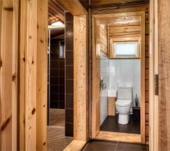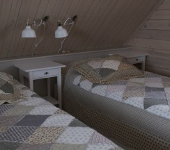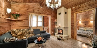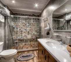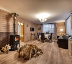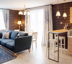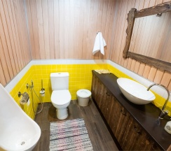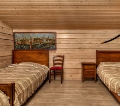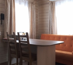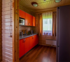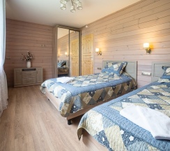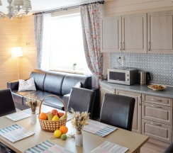 Прихожая с подогревом полов, зеркальным шкафом-купе и комодом. Две уютные спальни предлагают гостям разные варианты размещения: в первой – двуспальная кровать, во второй – две полутораспальные. Гостиная – сердце коттеджа, где кухонная зона оснащена всем необходимым: чайник, капсульная кофемашина Nespresso, микроволновая печь, газовая панель, холодильник и полный набор посуды, кондиционер. Здесь же, у камина, расположена зона отдыха с удобной мебелью и телевизором. Санузел с подогревом полов оснащен душевой кабиной, умывальником, зеркалом с подсветкой, унитазом и полным набором средств гигиены. На просторной террасе, укутавшись в мягкие пледы, можно наслаждаться тишиной и свежим воздухом. Для самых маленьких гостей по запросу предоставляется детская кроватка и стульчик для кормления. В качестве комплимента вас ждут две бутылки питьевой воды, чай, кофе и нежное печенье.