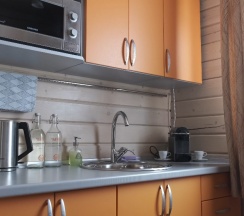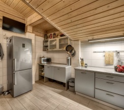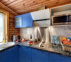 Для полноценного банного спа-отдыха дом оснащён всем необходимым: мягкими полотенцами, просторными банными простынями, шапочками для парилки, удобными тапочками, а также туалетными принадлежностями для ухода за телом и поддержания гигиены. Кухонная зона оборудована холодильником, микроволновой печью, чайником, набором посуды для сервировки и столовыми приборами, а также капсульной кофемашиной Nespresso, чтобы каждое утро начиналось с бодрящего аромата свежесваренного кофе.
