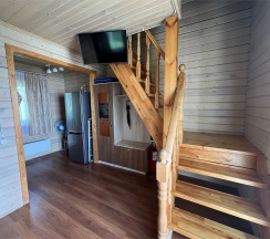 Уютный двухэтажный коттедж площадью 45м2 словно создан для безмятежного отдыха. На первом этаже вас встретит светлая гостиная, плавно перетекающая в кухонную зону, и компактный санузел. На втором этаже, под крышей здания, находится спальня. Здесь можно разместиться по-разному: две отдельные односпальные кровати, одну большую двуспальную кровать или четыре односпальные кровати. Это позволяет сделать комнату удобной для всех, кто здесь живет. Небольшая, но функциональная кухня оснащена всем необходимым: микроволновой печью, чайником, холодильником, капсульной кофемашиной и набором посуды для сервировки. В уютной столовой зоне расположился обеденный стол со стульями, мягкий диван и телевизор для вечернего отдыха. Для самых маленьких гостей по запросу предоставляется детская кроватка и стульчик для кормления. Из гостиной есть выход на террасу, где так приятно расслабиться на свежем воздухе. Этот домик станет идеальным местом для восстановления сил после рыбалки или охоты, а также для незабываемого отдыха в кругу друзей и близких, которые непременно оценят возможность провести выходные вдали от городской суеты. Каждый уголок коттеджа согрет заботой и уютом, создавая ощущение долгожданной встречи. В качестве приятного комплимента вас ждут две бутылки питьевой воды, чай, кофе и печенье. А для семей с детьми мы бесплатно предоставим детскую кроватку и стульчик для кормления. Небольшая терраса с удобной мебелью у входа и балкон на втором этаже станут любимыми местами для утреннего кофе и вечерних посиделок.
