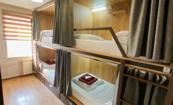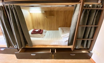 Номер с оптимальным соотношением цены и качества. У каждой кровати есть шторка, полочка, розетка, прикроватный светильник и личный шкафчик с ключом. При бронировании на месяц цена составит 18000.