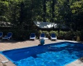 Банный комплекс большой, 2 купили с разной водой (горячая и холодная), два бассейна (детский и взрослый) + лежаки, спа зона, зона релакса. Костёр в центре территории, который вечером зажигают. При ночной пожсветке территории, смотрится просто супер. Домики потрясающие. Внутри все классно обустроенно, все очень удобно, все в экостиле. Кролики бегают по территории, что вызывает только умиление. Потрясающе вкусный завтрак на красивой веранде. Бесплатная парковка с тропинкой к речке.