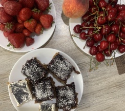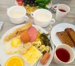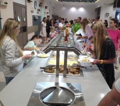 Еда вкусная,разнообразная( но если хотите изысков 'их там не будет) обычная столовская еда. Макароны,рыба, баранина, курица, пару супов и пару десертов и т.д. 1 день была горбуша вкусная в целом все. Фрукты( яблоки, персики)