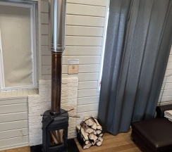 Просторная гостиная с дровяным камином, оснащена удобной кухонной зоной с холодильником, газовой плитой, тостером и электрочайником.