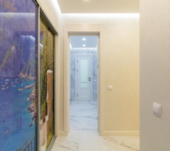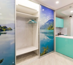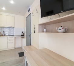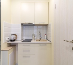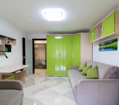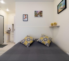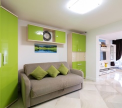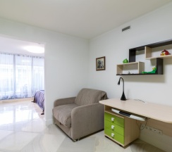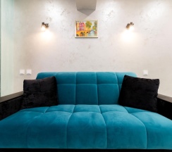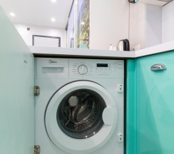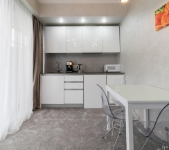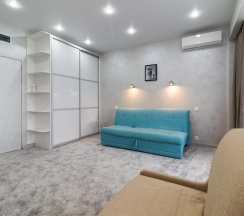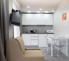 Для удобства и комфортного проживания в апартаментах имеется: итальянская система раскладывающейся кровати, одноместное кресло-кровать, 2-х створчатый шкаф-купе, стиральная машина, паровой утюг и гладильная доска, напольная сушка, пылесос, авторский декор.