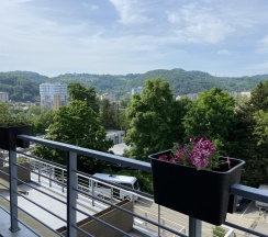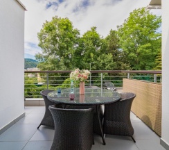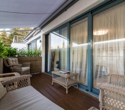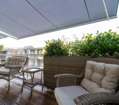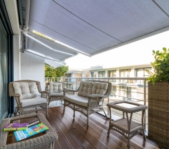 3-х комнатные двухуровневые апартаменты с 2-мя сан. узлами и собственной большой террасой, с которой открывается красивый вид на горы — это идеальный вариант для ценителей комфорта и размещения до 6-ти гостей. Общая площадь — 90 кв. м. Для удобства гостей апартаменты оснащены всей необходимой мебелью и бытовой техникой. Вход в апартаменты расположен на 1-м этаже. Апартаменты имеют панорамное витражное остекление, москитные сетки. Терраса оснащена большим обеденным столом и креслами из ротанга.