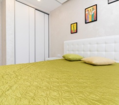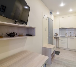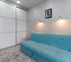Для удобства и комфортного проживания в апартаментах имеется: двуспальная кровать с ортопедическим матрасом, 2-местный диван-кровать, 3-х створчатый шкаф-купе, стиральная машина, паровой утюг и гладильная доска, напольная сушка, пылесос.