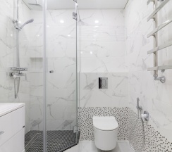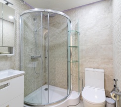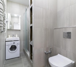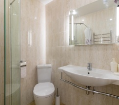 На каждом этаже апартаментов предусмотрена отдельная туалетная комната: на первом этаже размещена душевая кабина, раковина и сан. узел. На втором этаже — полноценная ванна, сан. узел, большое зеркало, фен, полотенцесушитель и автономная бойлерная система для бесперебойной подачи горячей воды.