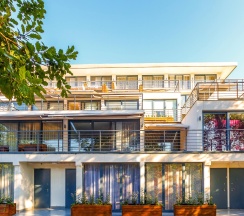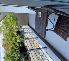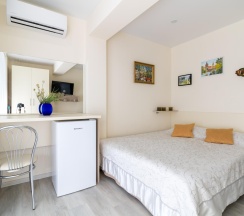 Апартаменты с двуспальной кроватью — идеальный вариант для деловой поездки или отдыха на море 1-2 гостей. Общая площадь – 20 кв. м. Для вашего удобства апартаменты оснащены современной мебелью и бытовой техникой. Расположены на 1 этаже с видом на внутренний дворик, имеют отдельный вход. Апартаменты имеют панорамное витражное остекление и москитную сетку. Рядом со входом в апартаменты выставлена плетенная мебель из ротанга.
