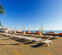 Хороший ограждённый собственный пляж с лежаками и навесом. И главное - мало людей, так как пляж частный, очень непривычно.