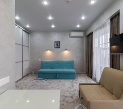 Апартаменты выполнены в современном дизайнерском стиле с креативной многоуровневой подсветкой и авторским декором. Идеальный вариант для размещения до 4-х гостей. Общая площадь — 40 кв. м. Апартаменты имеют панорамное витражное остекление, москитные сетки. Рядом со входом в апартаменты выставлена плетенная ротанговая мебель. Апартаменты расположены на 1 этаже с видом на внутренний дворик и имеют отдельный вход.