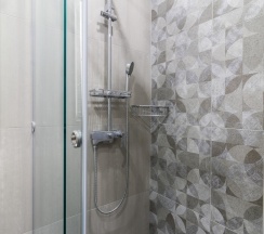 Собственная ванная комната оснащена душевой кабиной, большим зеркалом, феном и автономной бойлерной системой для бесперебойной подачи горячей воды.
