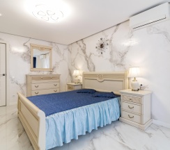 Для комфортного проживания в апартаментах предусмотрены: двуспальная кровать с ортопедическим матрасом, два раскладывающися 2-х спальные диван – кровати, два 3-х створчатых шкаф-купе, шкаф с полками, платяной шкаф, прикроватные тумбочки, комод, стол обеденный, стулья, стиральная машина, паровой утюг и гладильная доска, напольная сушка, пылесос.