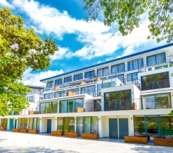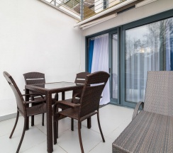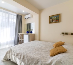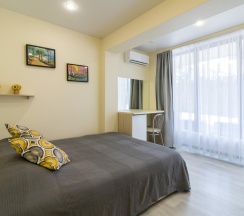 Апартаменты с двуспальной кроватью — идеальный вариант для деловой поездки или отдыха на море 1-2 гостей. Общая площадь – 20 кв. м. Для вашего удобства апартаменты оснащены современной мебелью и бытовой техникой. Расположены на 1 этаже с видом на внутренний дворик, имеют отдельный вход. Апартаменты имеют панорамное витражное остекление и москитную сетку. Рядом с апартаментами выставлена ротанговая мебель.
