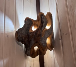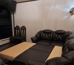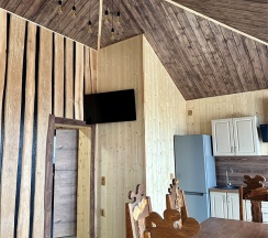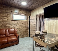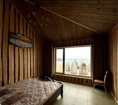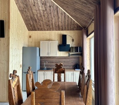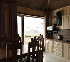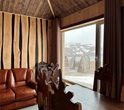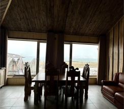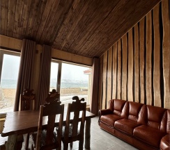 • Просторная гостиная с панорамным видом: Встречайте рассветы и провожайте закаты, не покидая уютную гостиную. Большой кожаный диван, массивный деревянный стол ручной работы и эксклюзивные деревянные стулья создают неповторимую атмосферу.