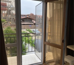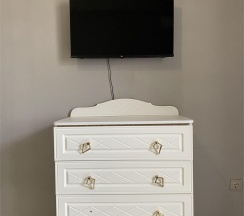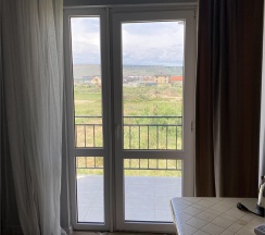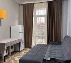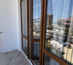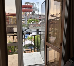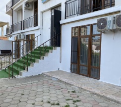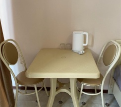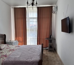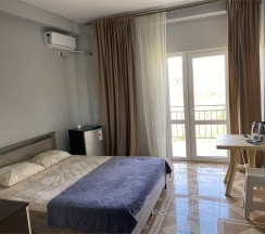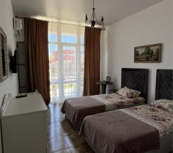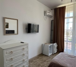 двухкомнатный номер с двумя балконами окна смотрят во двор так же имеется мини кухня, холодильник с морозилкой, электро чайник, раскладной диван, двуспальная кровать , шкаф для одежды. сплит система , ванная и санузел. частичный вид на море.