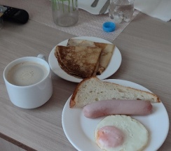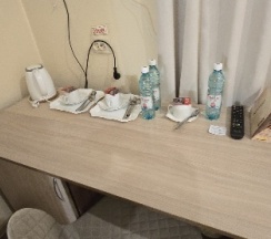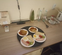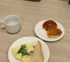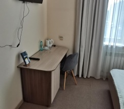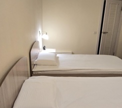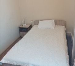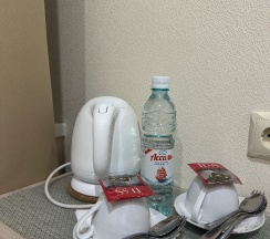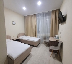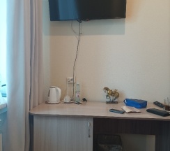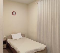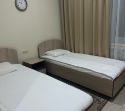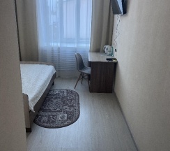 Хорошая ГОСТИННИЦА всё прилично, приятно находиться, в стоимость входит завтрак который приносят в 08:00. А завтрак это яйцо с сосиской, огурчик, помидорка и 2 блинчика с повидлом, чай и чайник, водичка в бутылочке все имеется. Полотенца кстати тоже имеются 2 и 1 дня ног. Постель белоснежная 👍