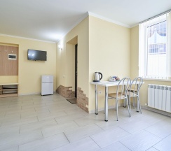 Номер с отдельным входом с улицы , с двуспальной кроватью,ванной комнатой,кондиционером,холодильником и обеденной зоной.